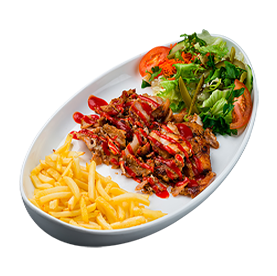 Accompagnée de salade, tomates, concombre, oignons, carottes râpées + Frites + 1 Boisson 33cl au choix.